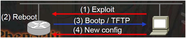 ابتدا مهاجم با استفاده از یک آسیب پذیری در حافظه NVRAM اختلال ایجاد میکند (قسمت1 ) . IOS پس از مشاهده مشکل در بخشی از حافظه، دستگاه را reload میکند (قسمت 2 ) . در قسمت 3 روتر نمیتواند config معتبری پیدا کند پس به bootp مراجعه میکند تا با استفاده از یک سرویس از راه دور بتواند یک config معتبر پیدا کند. پس به TFTP برای پیدا کردن کانفیگ معتبر مراجعه میکند. در این قسمت هکر ، config مورد نظر خود را با استفاده از آسیب پذیری موجود در TFTP ، به روتر اعمال میکند و روتر مورد نفوذ شخص مهاجم قرار میگیرد.