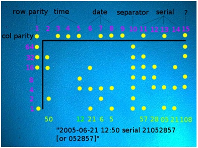 در نگاه اول این نقاط کمی مبهم به نظر میرسد اما با hint ادمین مسابقه متوجه شدم مربوط به بحث printer stegano هست . تعدادی از پرینتر ها وجود دارند که هنگام پرینت ، نقاط زرد رنگ ریزی رو بر روی صفحه پرینت شده ، چاپ میکنند که حاوی اطلاعاتی همچون ساعت و تاریخ برگه پرینت گرفته شده و یک سری اطلاعات دیگه مثل شماره سریال یا هر چیز دیگه ای هست . با گوگل کردن به این لینک رسیدم . مسئله ای که بود این بود که در تصویر بالا یک ماتریس به ابعاد 8 در 17 مشاهده میکنید در حالی که در تصویر توضیح داده شده در لینک یک تصویر 8 در 15 مشاهده میکنید. پس منظور طراح سوال نباید دقیقا همین عکس باشه بلکه باید از عکس الهام گرفت تا دیکدینگ رو انجام بدیم.