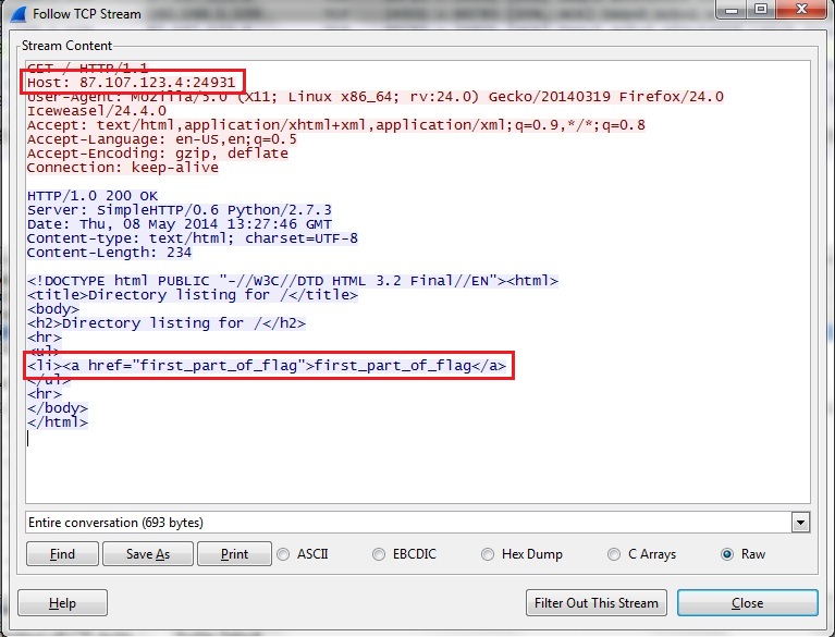 9264 11780 2059 8334بعد از پیدا کردن ترتیب پورت ها نیاز هست که یک درخواست TCP به شماره پورت مورد نظر ارسال شود که خب بسیار سادست . با هر ابزاری که بتوانید پکت SYN ارسال کنید به هدف نزدیک شده اید. من راه خیلی ساده ای رو انتخاب کردم به خود آدرس مقصد و شماره پورت در داخل Browser این درخواست رو ارسال کردم که در نهایت پورت مورد نظر باز شد یک فایل به نام به نام first_part_of_flag دانلود شدکه بخش اول فلگ در اون وجود داشت . کافیه تا کلمه flag رو در ترافیک جستجو کنیم تا آدرس بقیه بخش های فلگ رو هم بدست آوریم و دانلود کنیم و فلگ تکمیل می شود. فلگ نهایی به صورت زیر خواهد بود