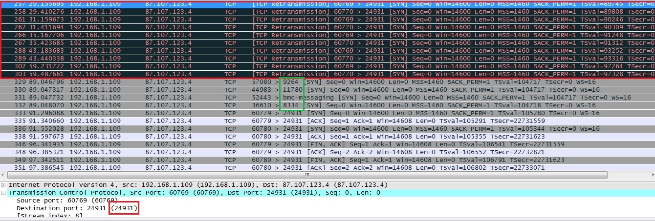 اگر در تصویر دقت کنید ( سعی کنید کلیک کنید و عکس رو در سایز واقعی ببینید ) در ترافیک مشاهده میشود به مقصد مورد نظر زمانی که به پورت 24931 درخواست داده شده ، ارتباط handshaking برقرار نشده است اما در پکت های بعدی چند درخواست SYN ارسال شده و بعد Handshaking با مقصد برقرار شده که نشان میدهد ترتیب پورت های مورد نظر برای port knocking همان پورت ها هستند که در تصویر با کادر سبز مشخص شده اند. پس ترتیب پورت هایی که باید درخواست TCP به آنها ارسال بشه از سمت چپ به صورت زیر میشه