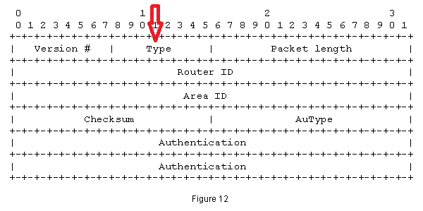 حالا بد نیست نگاهی به ساختار پکت OSPF v2 بندازیم . در شکل زیر ساختار را مشاهده میکنید. ما در این تست با فیلد type سروکار خواهیم داشت که در شکل با فلش قرمز مشخص شده است.