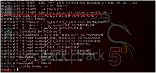با اجرای این دستور ، یک پکت OSPF تولید می شود که از نوع LS update است و حاوی دو LSA از نوع Router و Network است. به کادرهای قرمز عکس بالا توجه کنید که در آن یک پکت LS update با محتوای Router و طول برابر صفر را مشاهده میکنید. این بسته از طرف مبدا 192.168.0.107 به سمت شبکه broadcast می شود و روتر مقصد با آدرس 192.168.0.109 آن را دریافت میکند و چون 107 به عنوان روتر معتبر شناخته می شود بسته را دریافت میکند و به دلیل صفر بودن طول Router LSA در پردازش آن دچار مشکل می شود و دایمون ospfd کرش میکند. در تصویر یک نمونه را مشاهده می کنید که پس از رسیدن پکت تولید شده با دستور بالا به روتر مقصد ، دایمون کرش میکند و گزارشاتی مبنی بر کرش نیز تولید می شود .