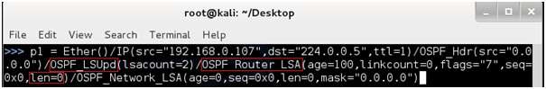 بررسی جزیی تر فیلد های این LSA ها به خواننده محترم واگذار میشود . پس از بررسی فیلدها ، قصد تولید پکت OSPF ی را داریم که حاوی این LSA ها باشد. که قصد داریم این کار را با Scapy و پلاگین معرفی شده انجام دهیم .پس از اجرای محیط Scapy ، دستور زیر را وارد کنید تا یک پکت OSPF با پارامترهای دلخواه ایجاد کنید.